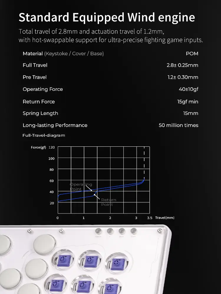 • Low-profile mechanical switch with 1.2mm actuation for accurate fighting game inputs.